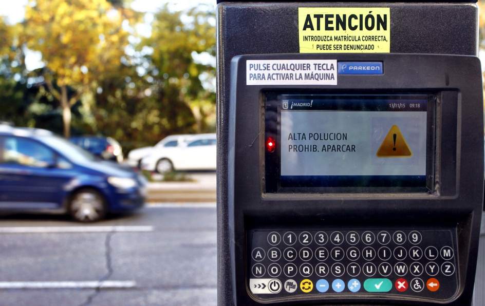 Los parquímetros de Madrid han amanecido este viernes con carteles de aviso a los usuarios donde se alerta de que no se puede estacionar por "alta contaminación", respondiendo así al escenario 2 del protocolo de medidas por polución. (JORGE PARÍS)-(20minutos.es)