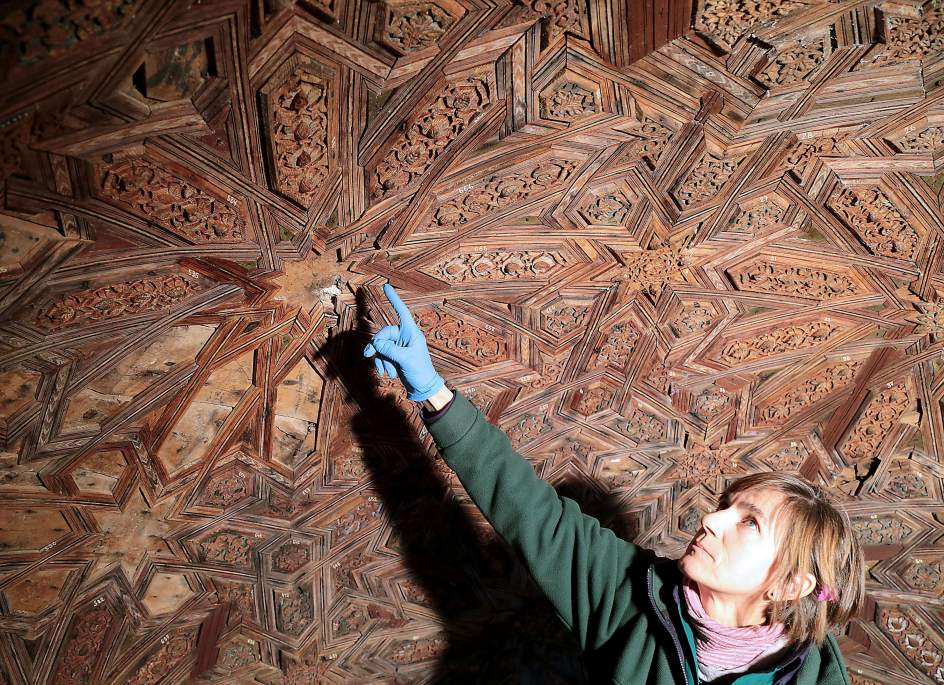 Una restauradora señala las piezas de madera que conforma la cúpula del templete oeste del Patio de los Leones de la Alhambra de Granada, cuyos trabajos de restauración de madera y yeso han desvelado dibujos de la época nazarí escondidos en el reverso de las piezas. (Pepe Torres / EFE)-(20minutos.es)