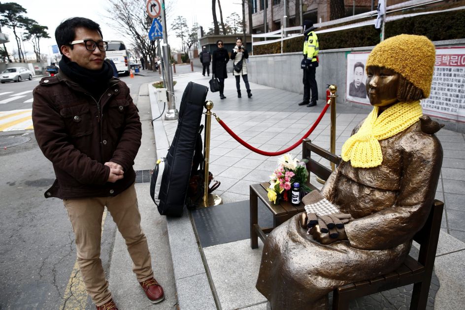 El cantante y activista surcoreano Lee Kwang-Seok observa la estatua que simboliza a las esclavas sexuales ante la embajada de Japón en Seúl (Corea del Sur). Corea del Sur y Japón alcanzaron un histórico acuerdo para zanjar una disputa que viene desde la Segunda Guerra Mundial. (Jeon Heon-Kyun / EFE)-(20minutos.es)