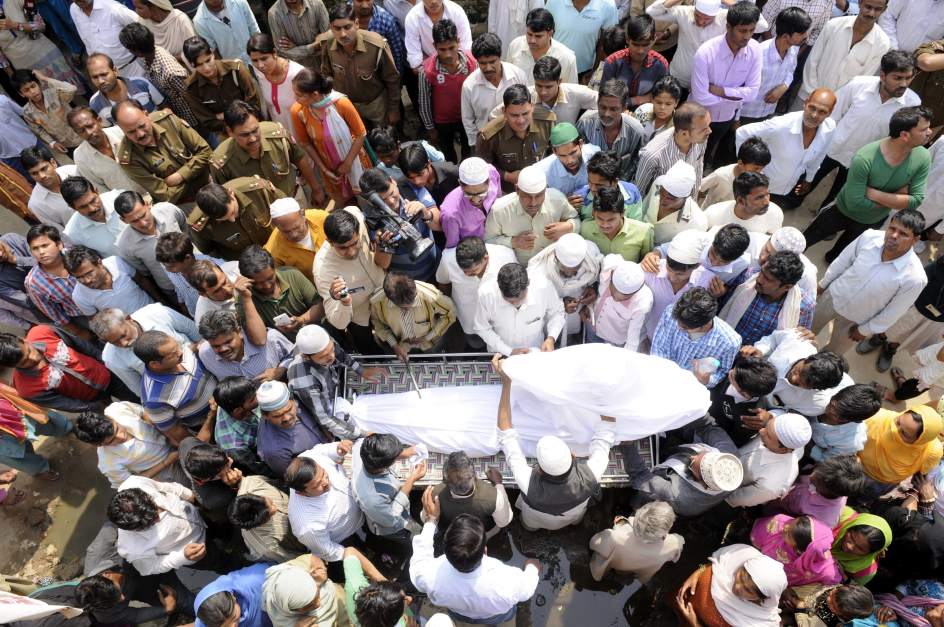 Un grupo de personas participa en el funeral de una adolescente de 15 años, que fue quemada viva tras ser violada, en el poblado de Tigri, en Greater Noida (India). La muchacha, que fue forzada por un hombre de 20 años que entró a la fuerza en su casa el pasado 7 de marzo, falleció este miércoles en el hospital. El atacante ha sido arrestado y será juzgado por homicidio y violación. (STR / EFE)-(20minutos.es)