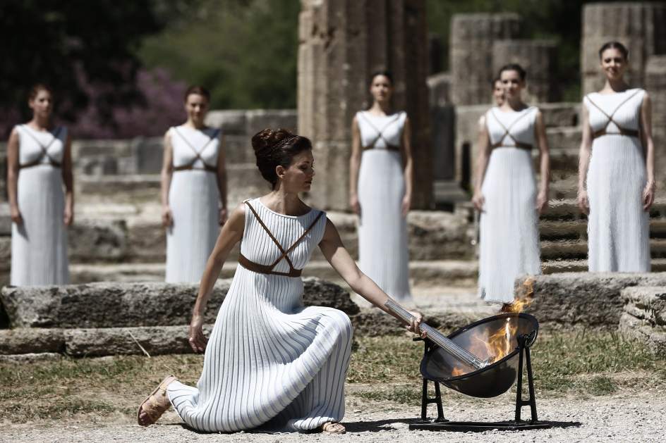 La actriz griega Katerina Lechou, participa en el ensayo del encendido de la llama de los Juegos Olímpicos de Río de Janeiro 2016, en Tanagra, Grecia., La antorcha olímpica se encenderá en Olimpia el próximo 21 de abril ante el templo de la diosa Hera y acabará su periplo por Grecia el 27 de abril en el estadio Panathinaiko, sede de los Juegos de Atenas de 1896. Allí será entregada formalmente a Brasil en una ceremonia que llevará a cabo la estrella del pop griego Sakis Rouvas. (Yannis Koles / EFE)-(20minutos.es)