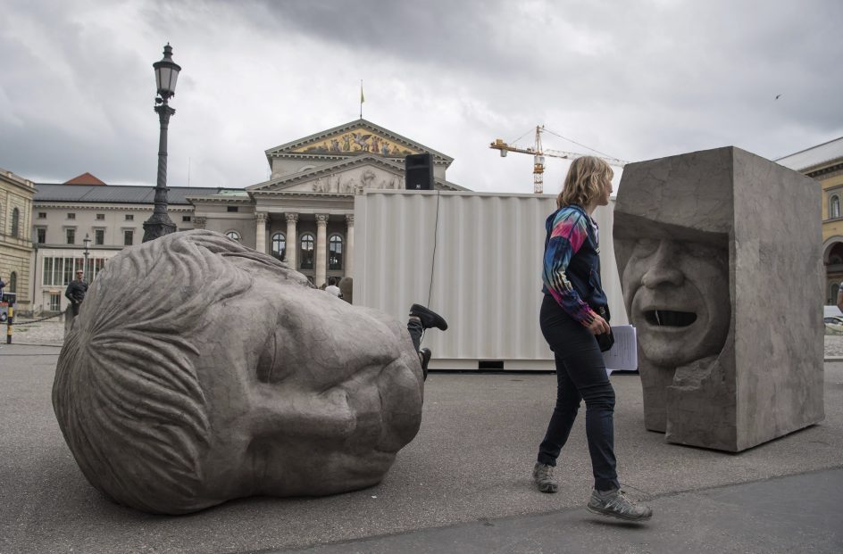 Dos esculturas gigantes que representan las cabezas de la canciller alemana, Angela Merkel (i), y la del presidente del Banco Central Europeo, Mario Draghi (d), yacen en la plaza Max-Joseph-Platz delante de la Ópera en Múnich, Alemania. La obra forma parte de la serie Die Irrenden. Europaeische Defiguration (Nómadas. Desfiguración europea) del dúo artístico Bankleer, y será expuesta del 1 hasta el 12 de junio. (Peter Kneffel / EFE)-(20minutos.es)