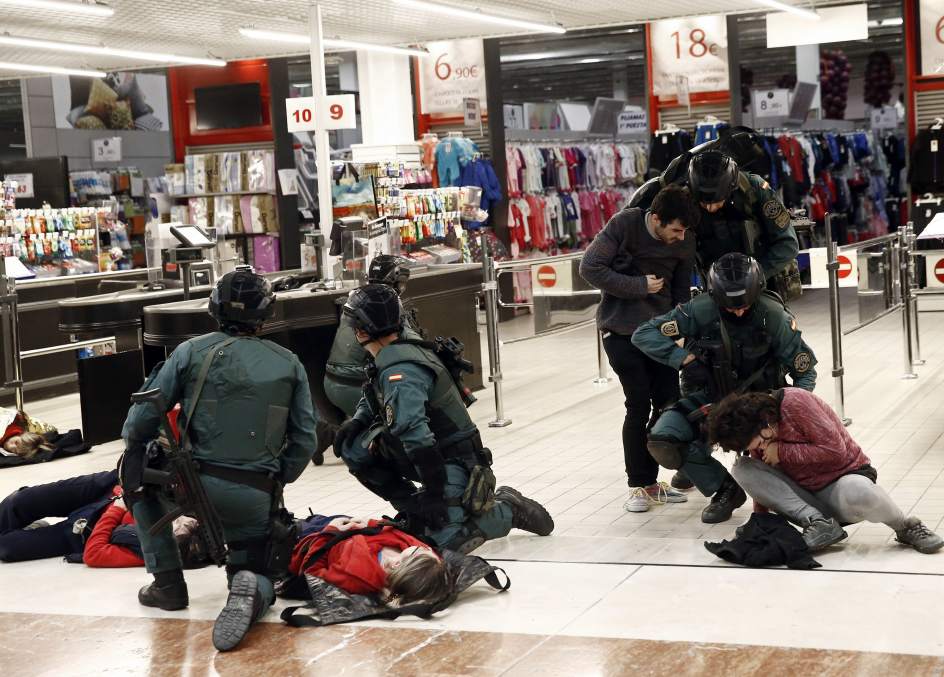 Efectivos de la Guardia Civil de los grupos antiterroristas, junto a varias victimas, durante el simulacro de atentado terrorista que ha tenido lugar esta madrugada en un centro comercial de Pamplona. (Jesús Diges / EFE)-(20minutos.es)