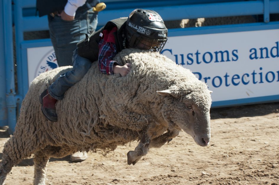 El concursante Xavier Cooperowers, de 5 años de edad, durante su participación en la categoría Mutton Bustin, que consiste en montar una oveja, en un rodeo celebrado en Tucson, Arizona (EE UU). (Gary M. Williams / EFE)-(20minutos.es)